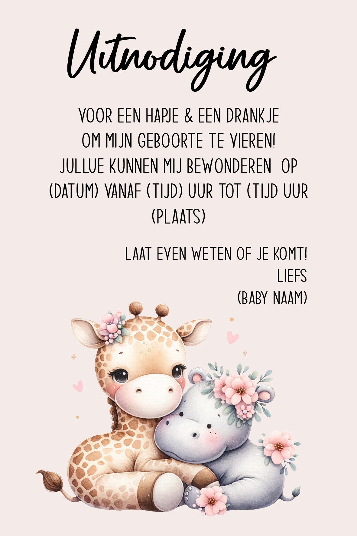 Uitnodiging Babyborrel giraf en Nijlpaardje